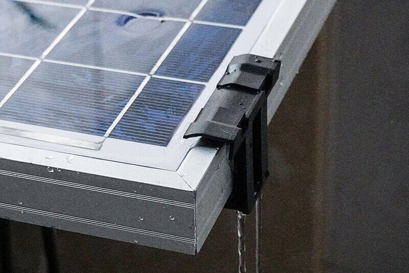 Klips wspomagający odprowadzanie wody i zabrudzeń z paneli fotowoltaicznych o grubości 30 mm. Stosowanie tego typu klipsów odprowadzających wodę ogranicza powstawanie zabrudzeń na powierzchni modułów PV co finalnie wpływa na ich wydajność.