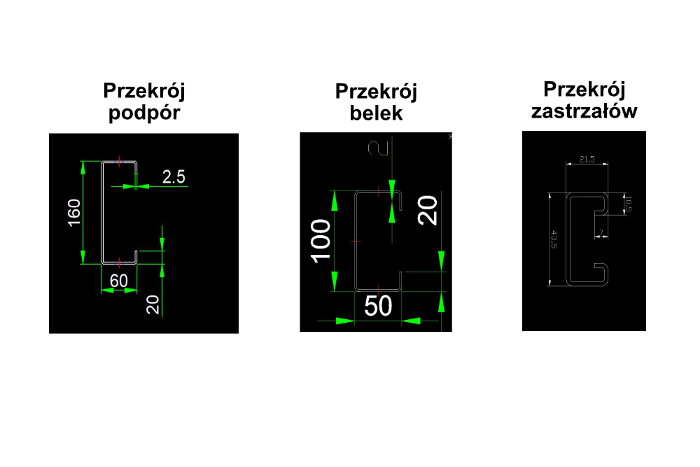 - Podpory, belki i profile o większym przekroju niż w typowych lekkich systemach